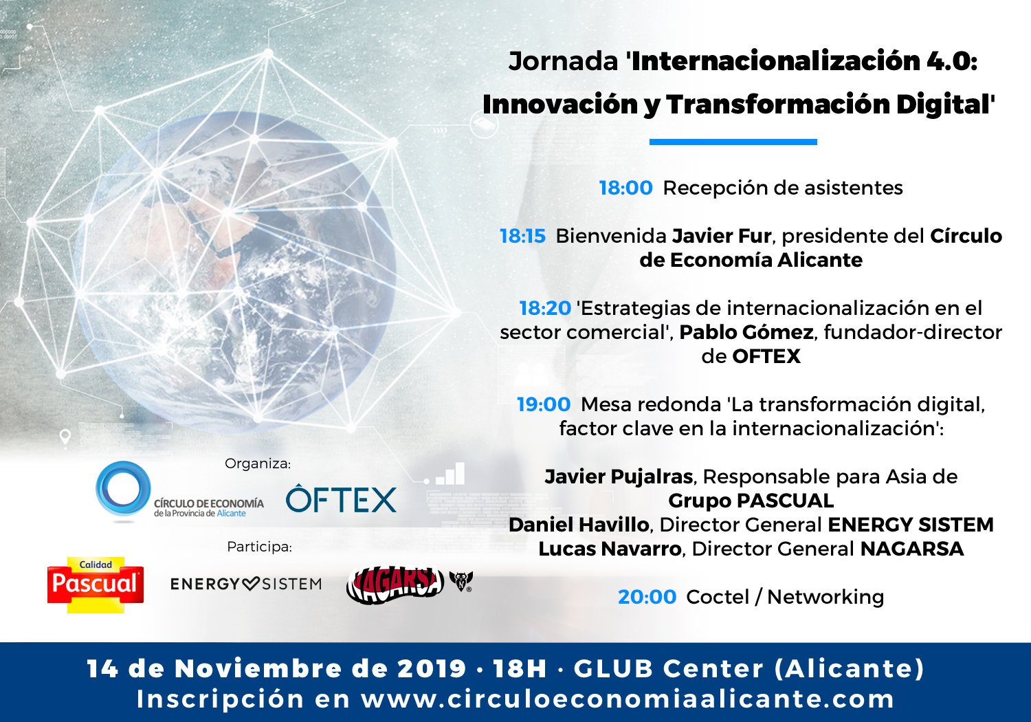 El Círculo de Economía de la Provincia de Alicante, junto a OFTEX (consultoría en comercio exterior), organizan el 14 de noviembre, a las 18:00h, la jornada ‘Internacionalización 4.0: Innovación y transformación digital’ en Glub Center (C/ Italia nº22) dirigida a empresarios y directivos de la pyme alicantina.
