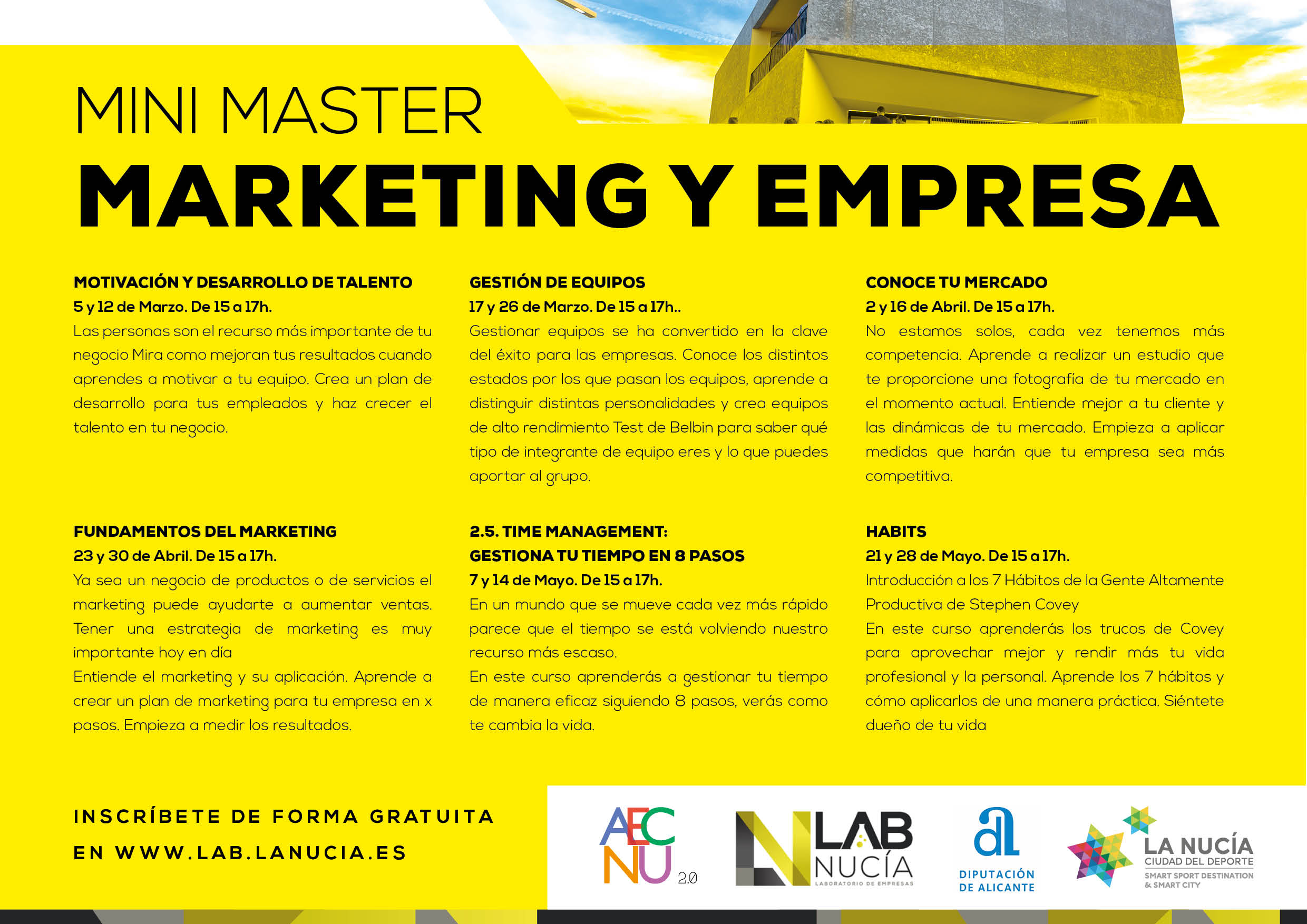 Este mini máster se compone de 6 bloques impartido en 12 sesiones de 2 horas cada una, en el LabNucia.