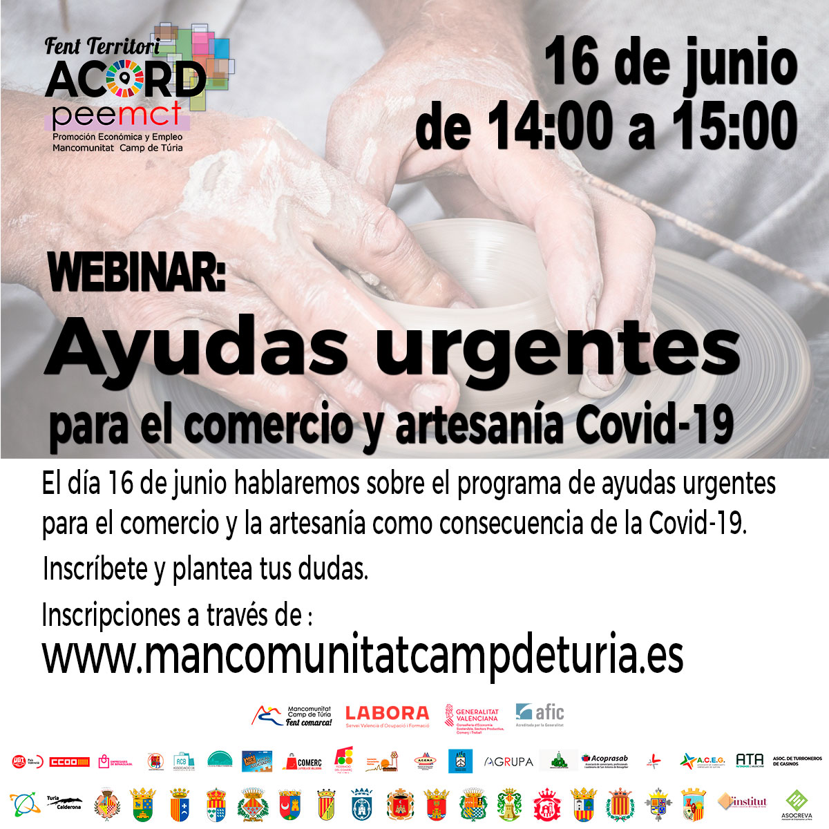 El próximo martes 16 de junio, a las 14:00 h, dede la sede de la Mancomunitat Camp de Túria, hemos organizado un Webinar en el que Salvador Olmos, Técnico de empresa de la Mancomunitat Camp de Túria, presentará el Programa de ayudas urgentes para el comercio y la artesanía como consecuencia de la Covid-19.