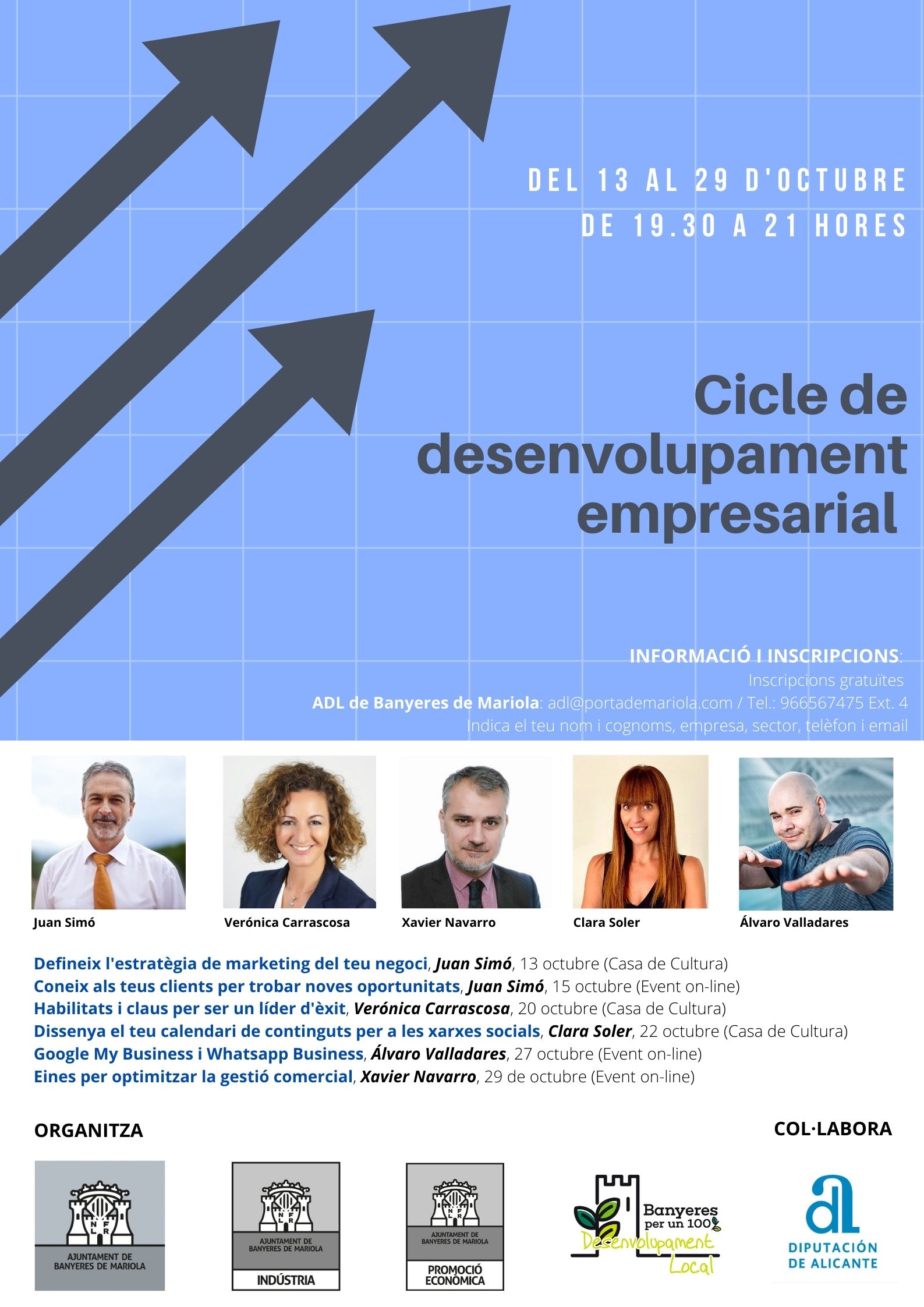 El Cicle de Desenvolupament Empresarial es una iniciativa que ofrece un programa de formación y capacitación para las empresas de los distintos sectores de actividad de Banyeres de Mariola y que estará desarrollado por expertos en la materia dentro de las distintas áreas de gestión de los negocios.