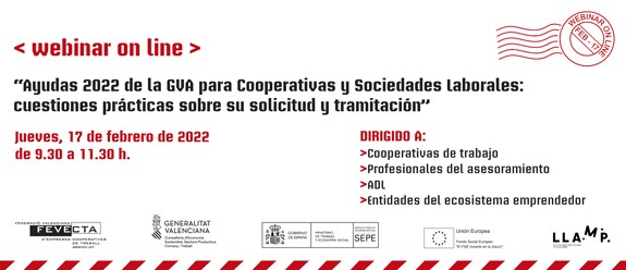 Desde el 31 de enero está abierto el plazo para solicitar las ayudas de 2022 de la Conselleria de Economía Sostenible, destinadas a fomentar la creación, consolidación y competitividad de las cooperativas de la Comunitat Valenciana. Por este motivo, FEVECTA organiza este webinar online a través de Zoom para que las cooperativas de trabajo interesadas y otras entidades prescriptoras puedan conocer en detalle cada una de las actuaciones subvencionables, así como cuáles son los obstáculos más comunes para acceder a ellas y, si es posible, la forma de evitarlos o salvarlos.