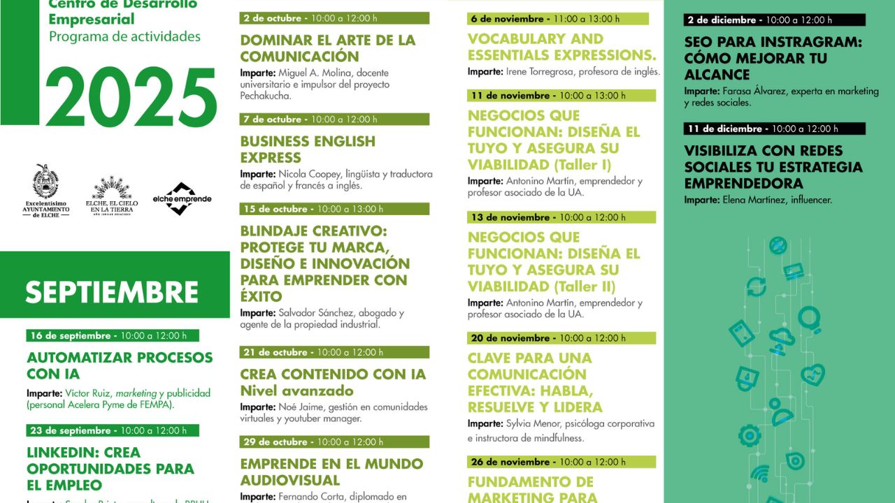 El programa comienza el próximo 16 de Septiembre y las acciones durarán hasta el 11 de diciembre, con varias actividades en septiembre, octubre, noviembre y diciembre. Los interesados ya pueden inscribirse desde el portal web del Centro de Desarrollo Empresarial de Elche.