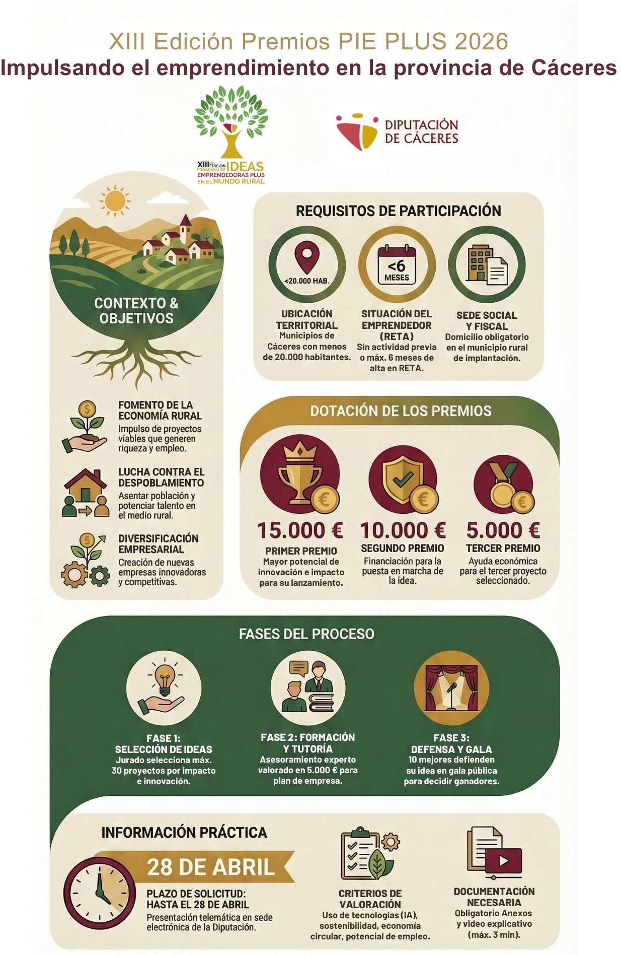 Se pueden presentar proyectos hasta el 28 de abril de 2026. Las solicitudes de participación se presentarán a través de la sede electrónica de la Diputación Provincial de Cáceres.
