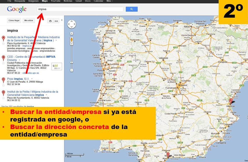 Una vez en el google maps, buscamos, como hemos dicho, o el nombre de la entidad/empresa (si ya está registrada), o la dirección concreta. En el caso de la imágen 2, hemos hecho la búsqueda de la Entidad/Empresa.