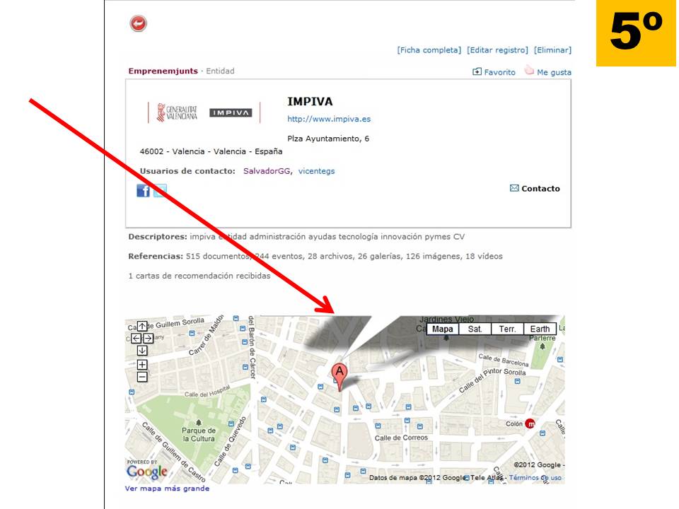 En la imágen nº 5 podemos ver un ejemplo de mapa incluido en la ficha de una Entidad/Empresa. Se trata en este registro de información de explicar cómo se puede incluir ese mapa, es decir, cómo subir, en este caso, un mapa en el que se pueda señalar claramente la situación o ubicación de la entidad/empresa.