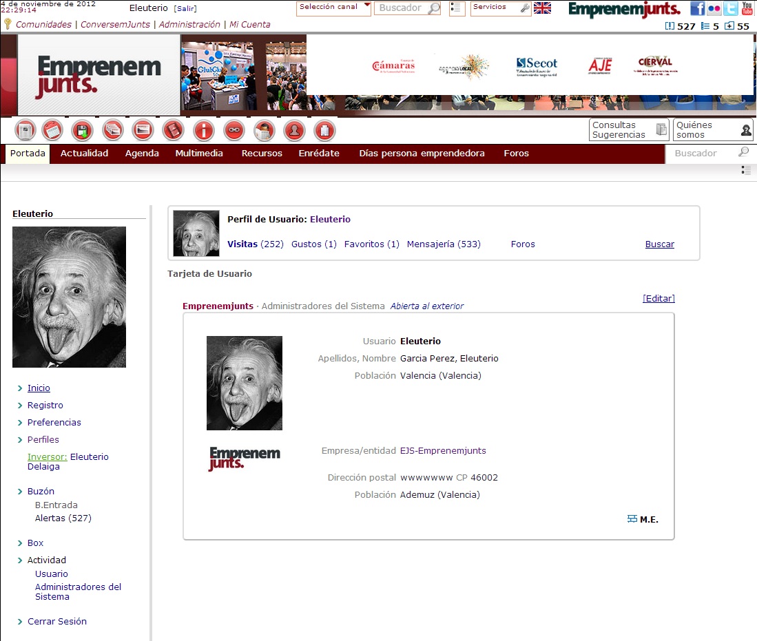 En la parte izquierda aparece un conjunto de opciones que conllevan utilidades que puede manejar el usuario, como, por ejemplo: Perfiles, Buzón, Box, y Actividad.