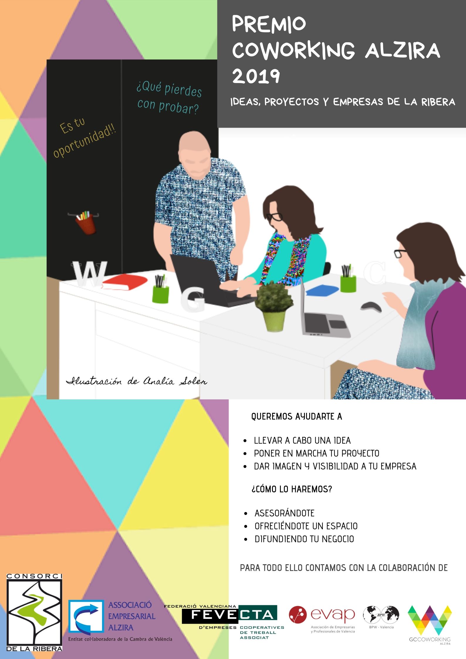 En Coworking Alzira, estamos comprometidas con el APOYO AL EMPRENDIMIENTO, LA CREACIÓN Y EL CRECIMIENTO DE LAS EMPRESAS, es una de las razones de la existencia de este espacio. Esto, junto con un fuerte sentimiento de comunidad y colaboración entre nuestros coworkers, nos impulsa a una constante búsqueda de fórmulas que nos ayuden a conseguir este propósito. Es por ello la creación de este premio, a través del cual, queremos aportar nuestro granito de arena a emprendedores, pequeñas empresas y profesionales que encuentran mayores dificultades en las fases iniciales. Esto no sería posible sin la colaboración del Consorci de La Ribera, FEVECTA, Asociación Empresarial Alzira y Evap Bpw Valencia.
