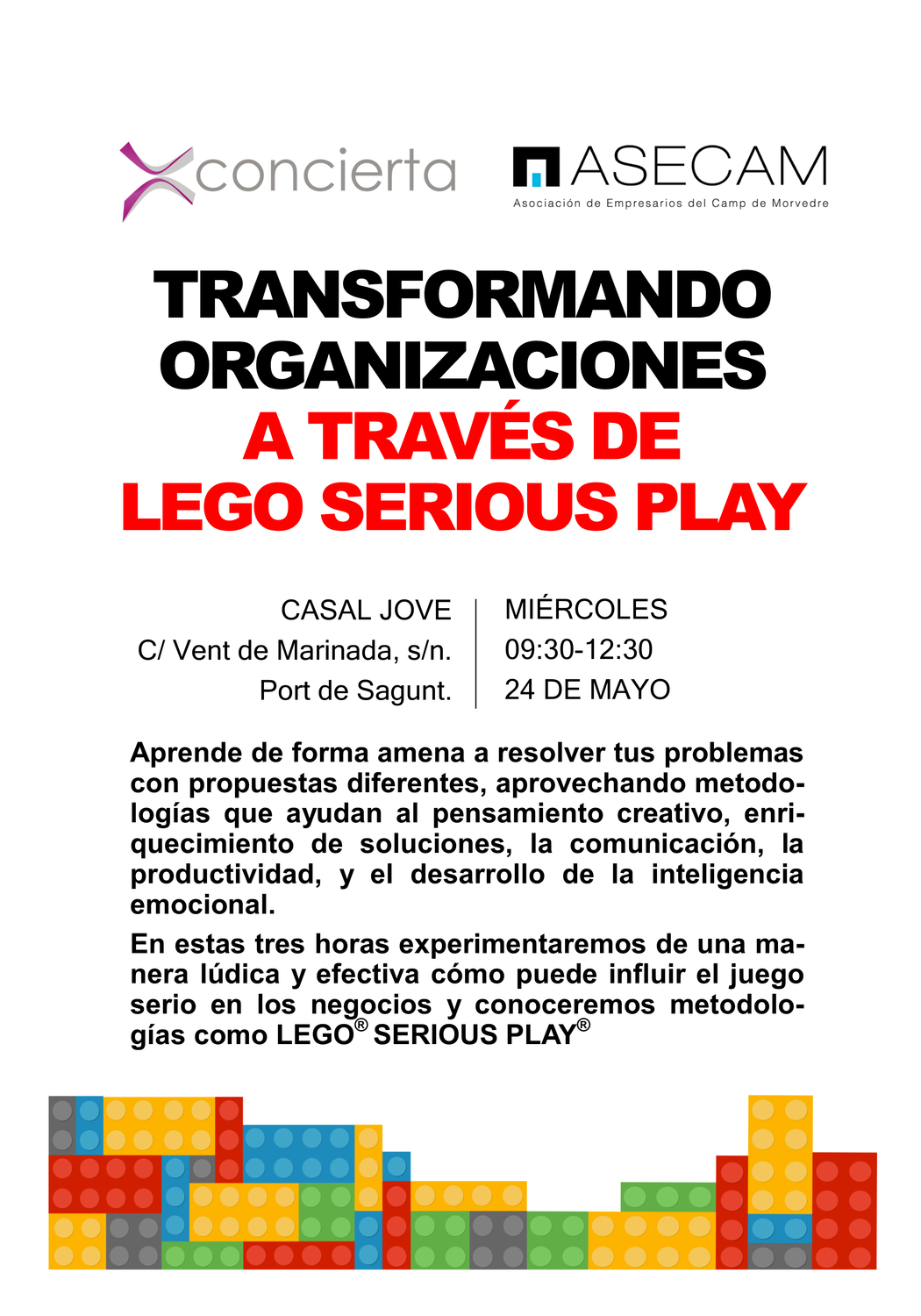 En estas tres horas experimentaremos de una manera lúdica y efectiva cómo puede influir el juego serio en los negocios y conoceremos metodologías como Lego® serious Play®