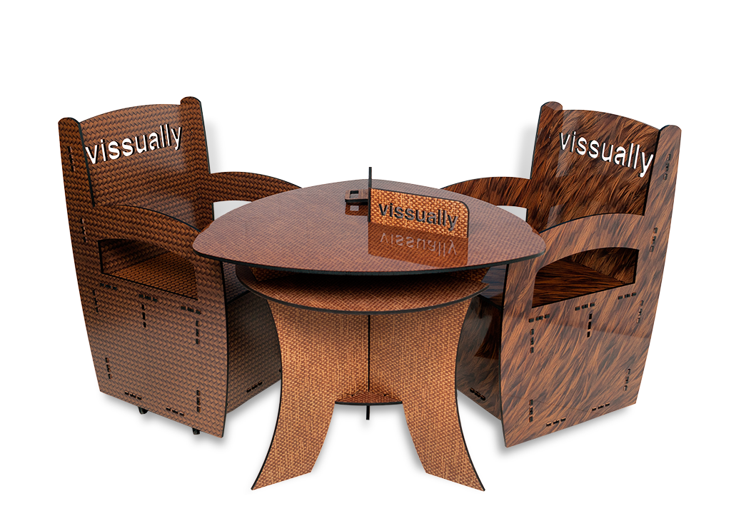 Mobiliario fabricado con fibra de madera renovable, MDF, cortado mediante láser. Las sillas llevan ruedas para mayor comodidad a la hora de moverlas. El mobiliario puede ser personalizado con el logotipo o nombre, textura y color que se elija, adaptándonos a la imagen que se quiera transmitir.
