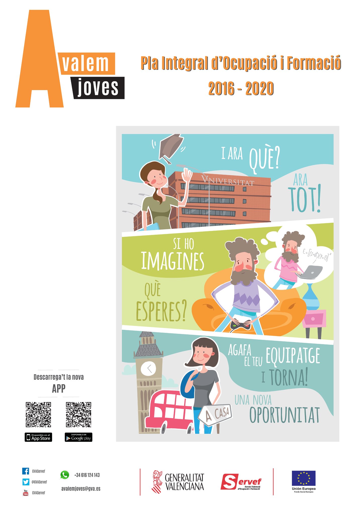 El Plan Integral de Formación y Empleo Avalem Joves de la Generalitat movilizará 205 millones de euros entre 2016 y 2020 con diferentes itinerarios, unos para la inserción y otros para la formación específica. Todo para jóvenes menores de 30 años. En los próximos meses se lanzará el resto de líneas de ayudas y formación del aval.