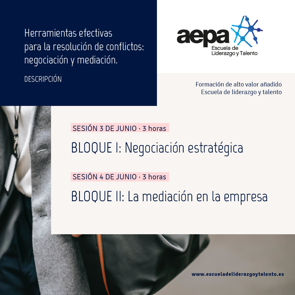 A través del taller conoceremos qué tipo de conflictos son los más frecuentes en el ámbito empresarial y profesional. Identificaremos los distintos métodos de resolución y cuáles son los criterios para elegir el más apropiado para cada tipo de conflictos y para cada tipo de empresa o profesional autónoma según las circunstancias del caso  y nos centraremos en conocer la Mediación, como método ágil y eficiente de resolución de conflictos en el ámbito de la empresa y para qué nos puede interesar acudir a los profesionales de la Mediación, explicado bajo el paraguas de los principios de este método de resolución de conflictos.