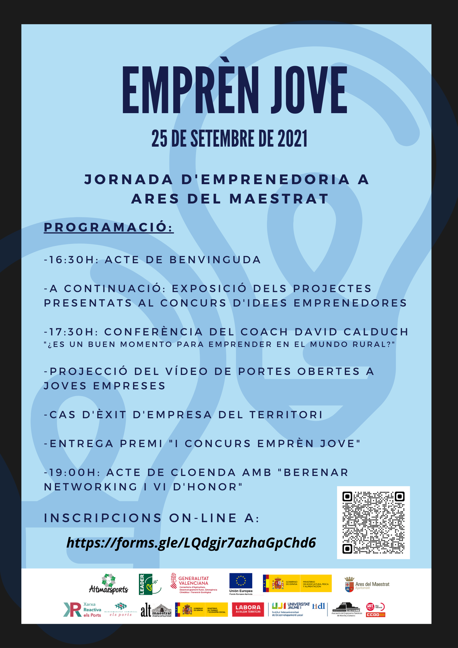 La Xarxa Reactiva els Ports juntament amb El Grup d’Acció Local Altmaesports Leader han organitzat una jornada d’emprenedoria per a joves de les comarques Els Ports i l’Alt Maestrat, el dia 25 de setembre per la vesprada al local multiusos d'Ares del Maestrat.