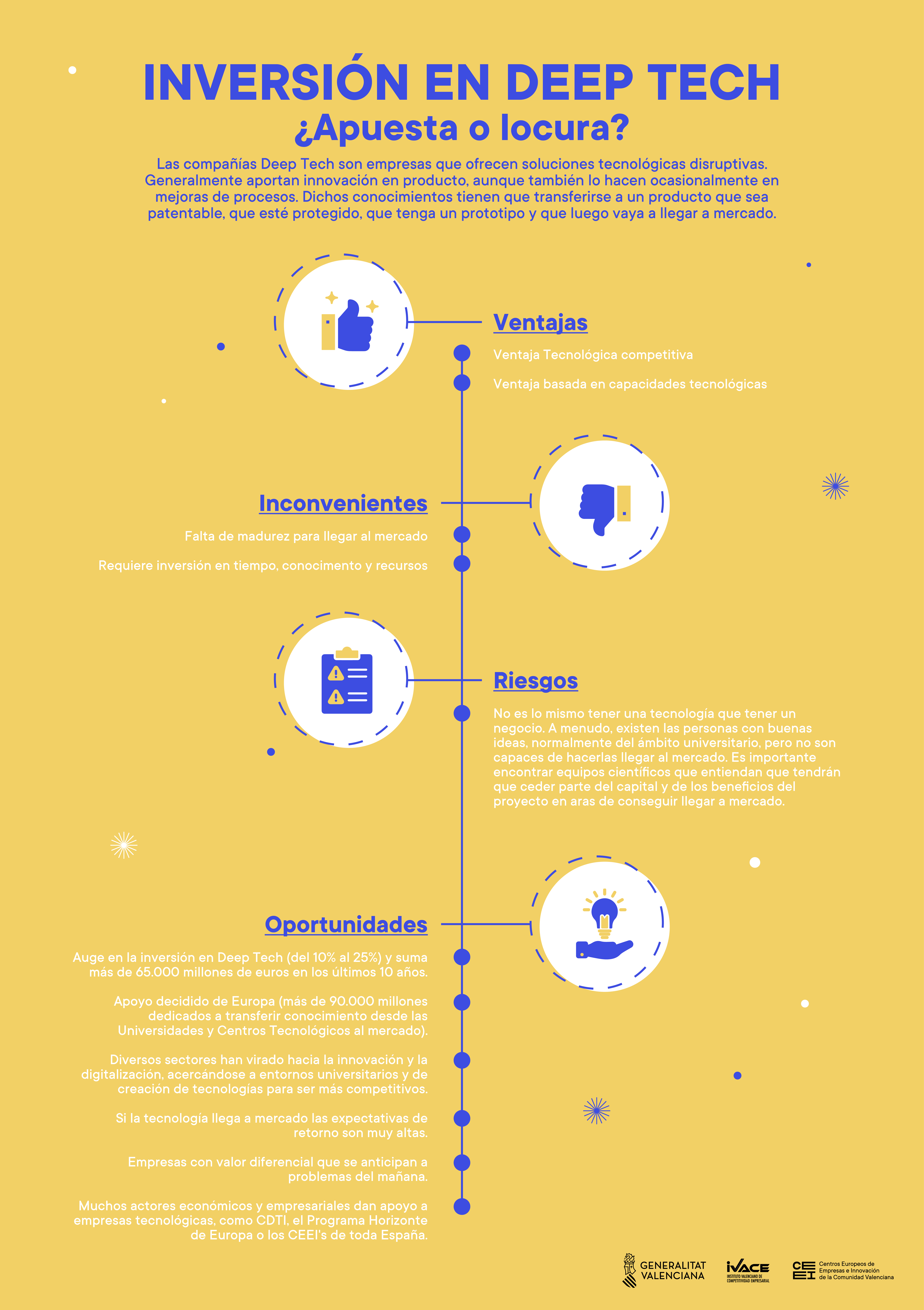 Las empresas Deep Tech hacen referencia a compañías que apuntan a soluciones disruptivas y están basadas en tecnologías. Generalmente aportan innovación en productos, aunque también lo hacen ocasionalmente en mejora de procesos.