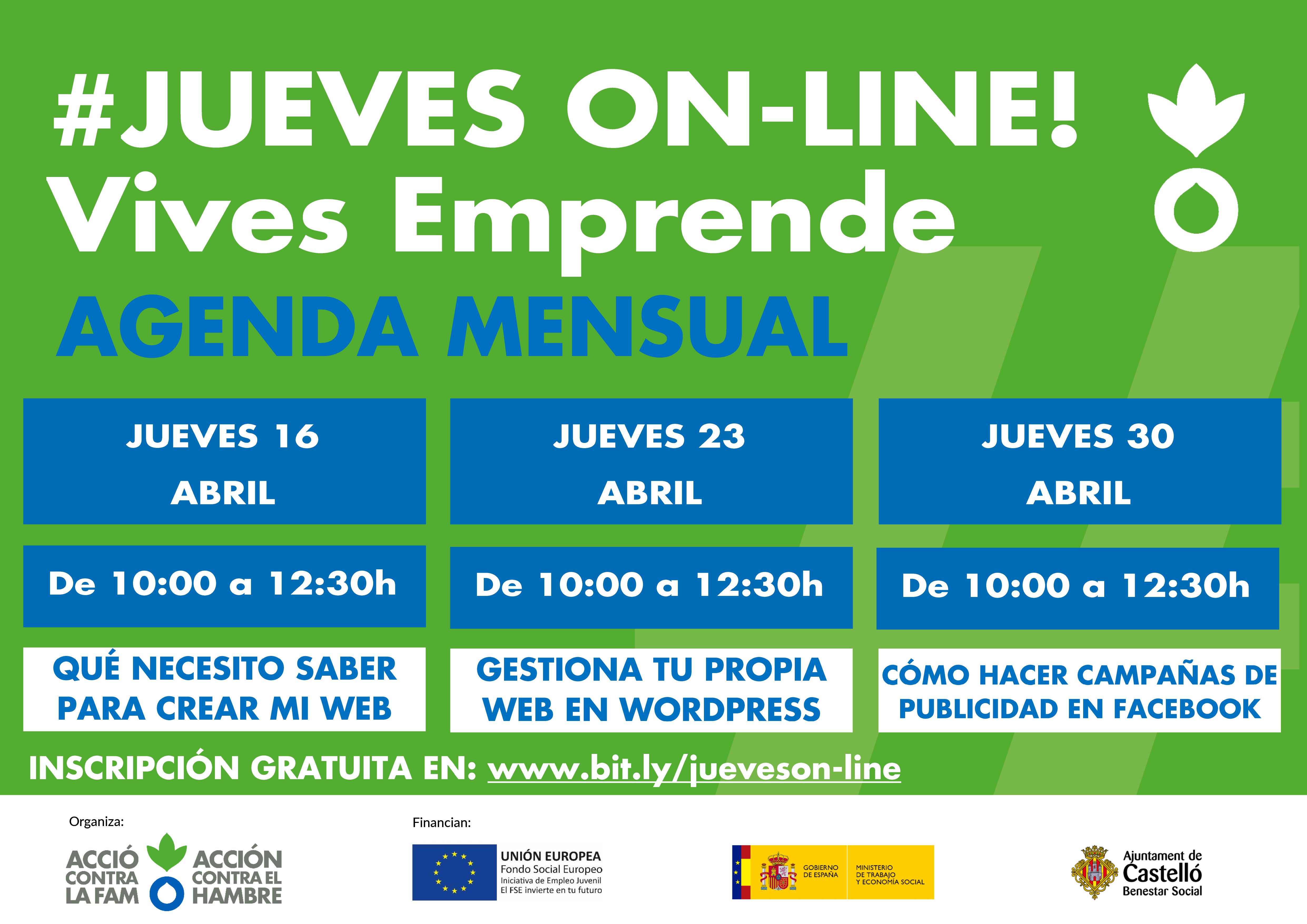 Con ilusión os informamos de la puesta en marcha de “Los jueves online”, los días 16, 23 y 30 de abril, como un recorrido formativo adaptado a las necesidades actuales. Es una formación práctica pensada para que las personas emprendedoras desarrollen mayores habilidades digitales que les permitan una mayor y mejor presencia de sus proyectos online.