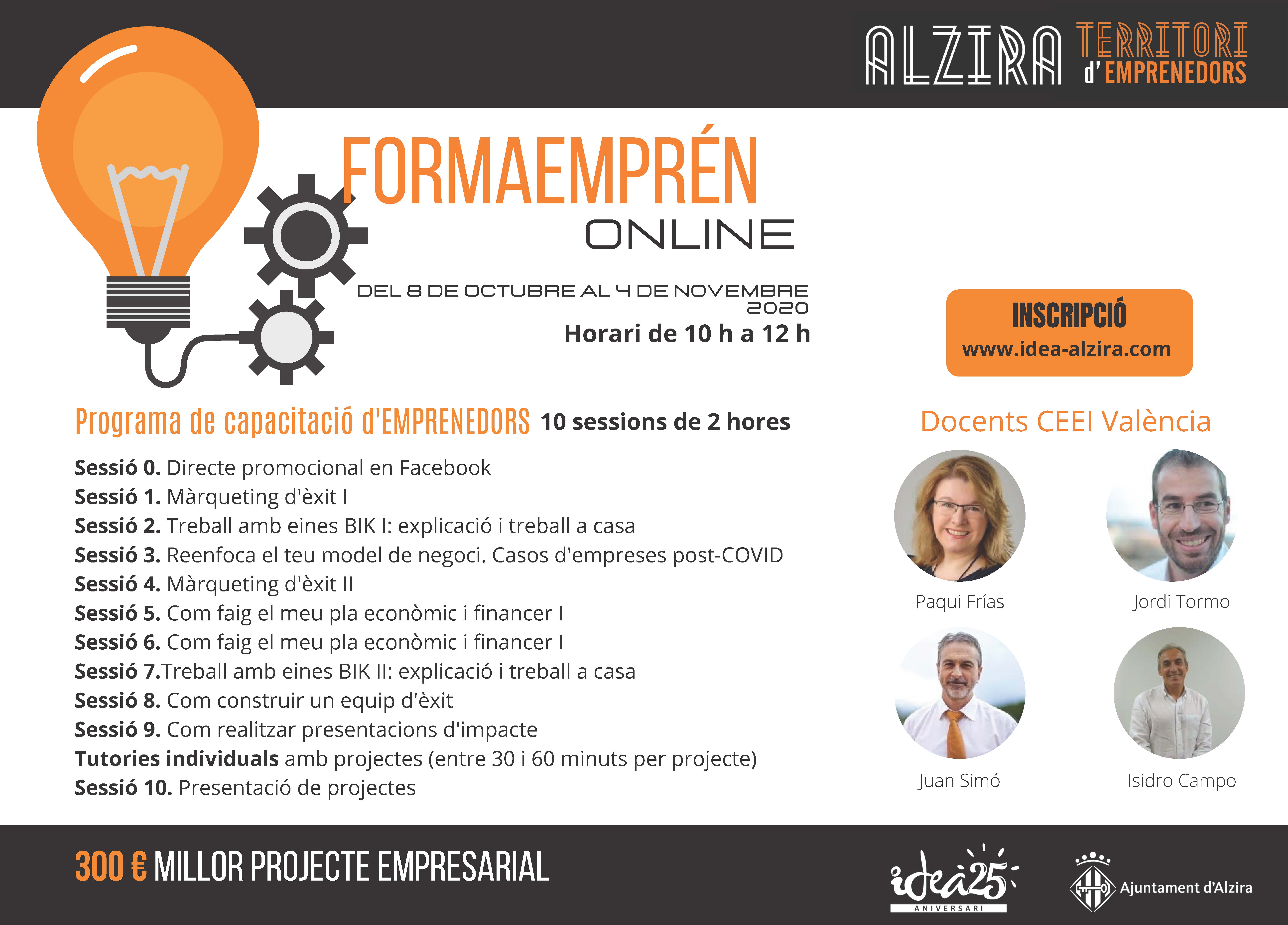 En este sentido, ponemos en marcha FORMAEMPRÉN, programa de entrenamiento, organizado por IDEA Alzira y el CEEI Valencia, con el que te capacitaremos en el proceso de puesta en marcha de tu proyecto y/o en la mejora de las técnicas de gestión empresarial si eres una empresa de reciente constitución.