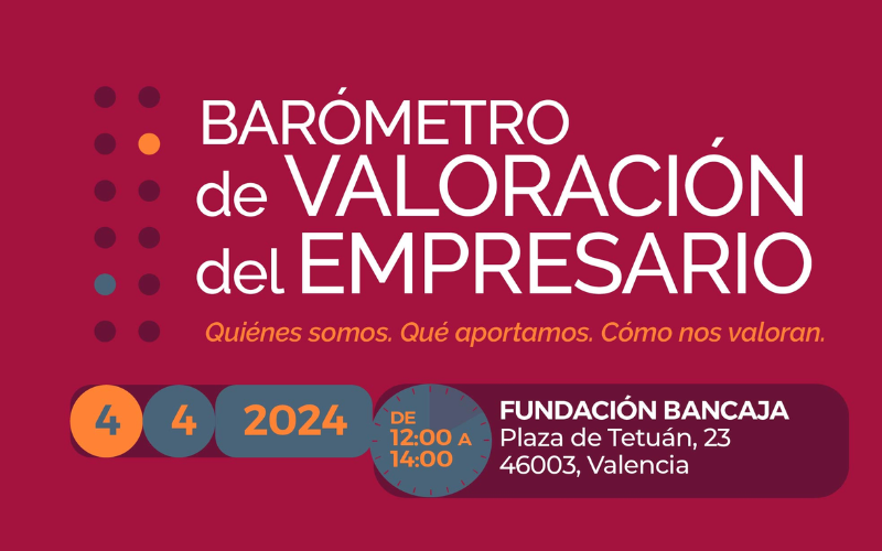 El próximo 4 de abril presentaremos los resultados de este año en un acto empresarial en el que nos encantaría contar con su asistencia. La Asociación Valenciana de Empresarios (AVE) ha impulsado el 2º Barómetro de Valoración del Empresario, un proyecto nacional que busca conocer y reevaluar anualmente la opinión de la sociedad española sobre los empresarios y empresarias.