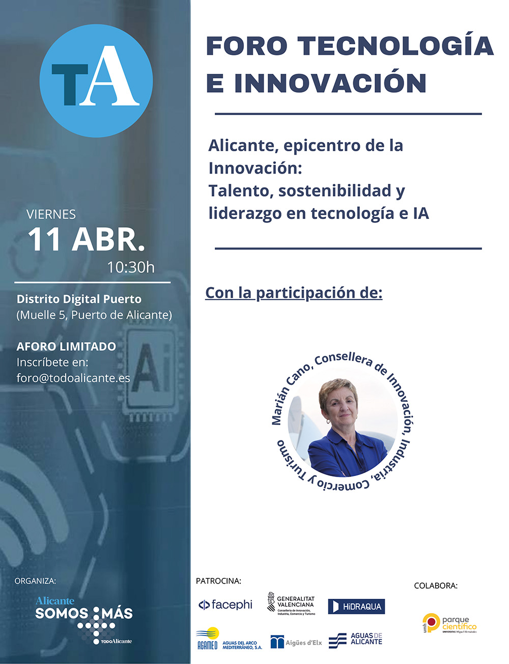 Arranca el proyecto Alicante Somos + que impulsamos en TodoAlicante con el fin de poner en valor todos y cada uno de los sectores que convierten a sus pueblos y gentes en únicos. Y lo hacemos de la mano de la consellera de Industria, Innovación, Comercio y Turismo, Marián Cano, que protagonizará este viernes 11 el Foro sobre Tecnología e Innovación en la sede del Distrito Digital del Puerto de Alicante bajo el lema 'Alicante, epicentro de la Innovación: talento, sostenibilidad y liderazgo en teconología e IA'