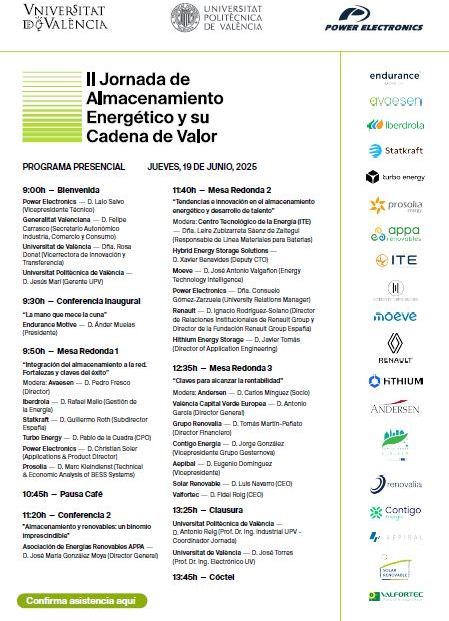 Tras el éxito de la primera edición, la Universitat de València y la Universitat Politècnica de València se unen de nuevo en las instalaciones de Power Electronics, para celebrar la II Jornada de Almacenamiento Energético y su Cadena de Valor.
