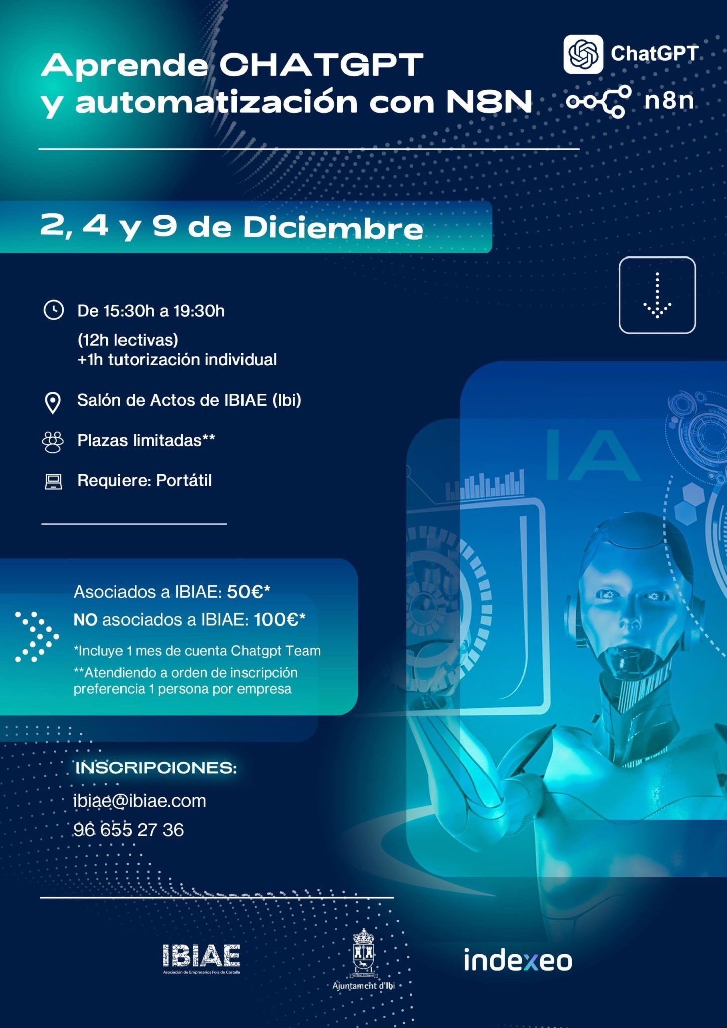IBIAE organiza junto INDEXEO MARKETING los días 2, 4 y 9 de diciembre una jornada formativa presencial para aprender a utilizar ChatGPT y N8N, la herramienta de automatización que permite optimizar procesos de trabajo sin necesidad de programar.