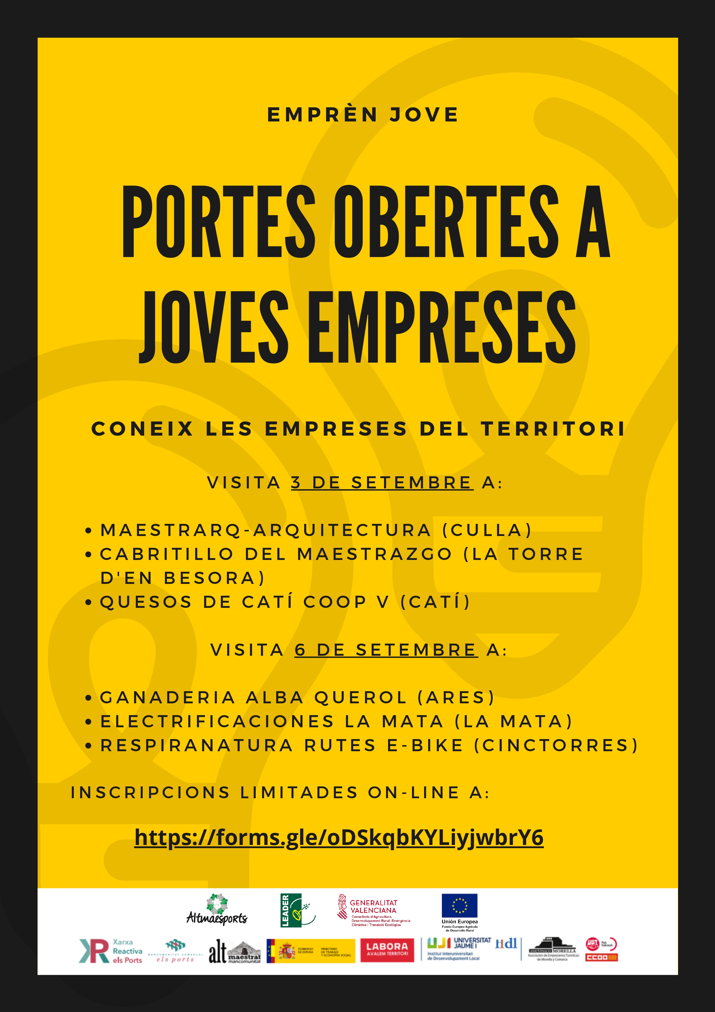 Des de la Xarxa Reactiva els Ports juntament amb el grup d’acció local Altmaesports us convidem a visitar diferents empreses dels Ports i l'Alt Maestrat, a joves del territori, per donar a conèixer la  trajectòria empresaria i conèixer de primera mà, el funcionament de diferents empreses del Alt Maestrat i de Els Ports.