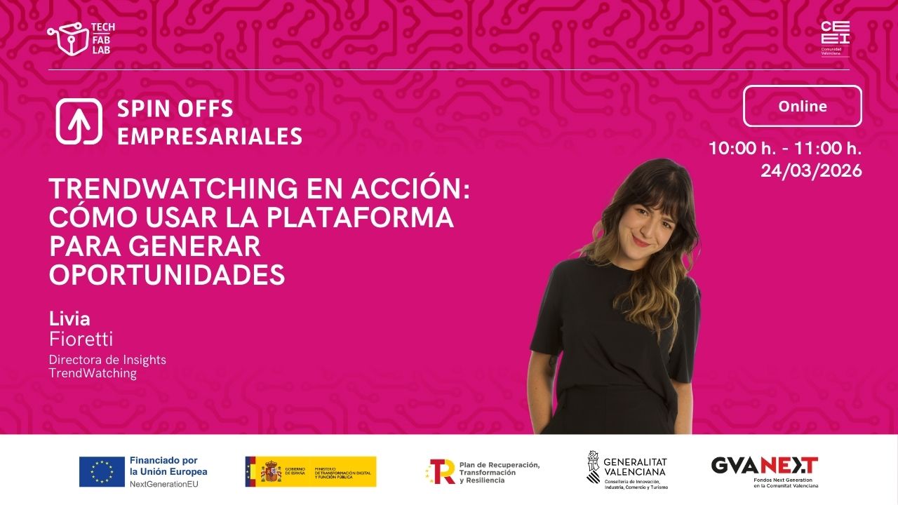 Esta sesión forma parte del proyecto Spin offs, encuadrado en el programa Tech FabLab de la convocatoria RETECH “Redes de Emprendimiento Digital”, financiada por el Plan de Recuperación, Transformación y Resiliencia del Ministerio para la Transformación digital y Función Pública a través de fondos europeos Next Generation EU. Se trata de una de las actuaciones que la Dirección General de Innovación ha activado en colaboración con la Red CEEI CV con el objeto de capacitar en tecnologías habilitadoras digitales y dinamizar la creación y el crecimiento empresarial mediante la innovación.