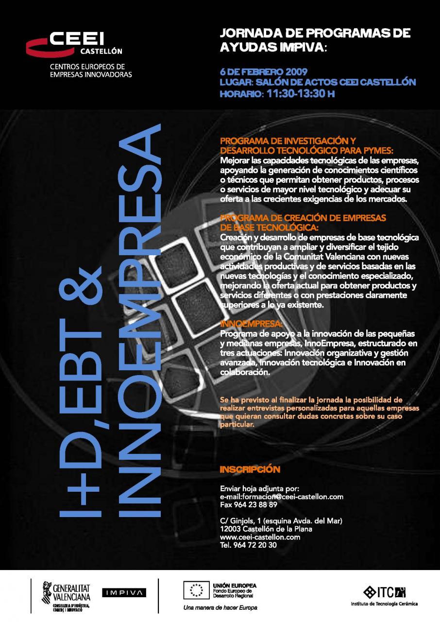 El CENTRO EUROPEO DE EMPRESAS INNOVADORAS de Castellón como cada año y en su misión de informar de las ayudas existentes de apoyo a PYMES :EBT, Creación de Empresas de Base Tecnológica, I+D, Programa de Investigacion y Desarrollo e INNOEMPRESA,programa de apoyo a la innovación de las pequeñas y medianas empresas , ha organizado una jornada técnica con representantes del IMPIVA para presentar y difundir los programas, así como resolver las dudas que surjan al plantear el proyecto.