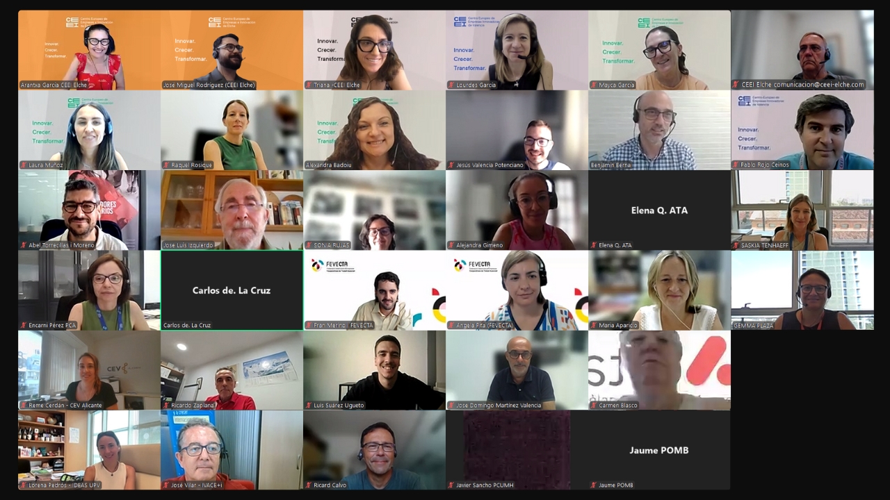 Al encuentro han asistido los agentes del ecosistema colaboradores de la organización de este Focus Pyme. En esta reunión han participado 34 representantes de IVACE+i, Dirección General de Emprendimiento e Internacionalización, CEEI Elche, CEEI Valencia, CEEI Castellón, AECTA, IDEAS UPV, Diputación de Valencia, FEVECTA Comunidad Valenciana, AVALNET, Entidad Urbanística de Conservación de Elche Parque Industrial, Consejo de Cámaras de Comercio de la Comunitat Valenciana, FECAP, GRIDET, AEPA, Parque Científico de la UMH de Elche, Diputación Provincial de Castellón, Observatorio Ocupacional de la Universidad Miguel Hernández de Elche, Asociación Juvenil Alicante Emprende, PEAKS Business School, Fundación Parque Científico de Alicante, CEV, ATA CV, CONVEGA, SECOT y Pacte Territorial per l’Ocupació de la Marina Baixa.