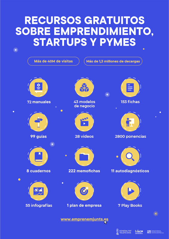 El Portal Emprenemjunts se ha convertido en una herramienta indispensable para personas emprendedoras y pymes, al ofrecer gratuitamente información, herramientas y recursos, además de impacto en redes sociales. Actualmente, existen más de 700 recursos gratuitos creados exclusivamente para emprendedores, startups y pymes donde pueden encontrar: Conocimientos básicos para gestionar y dirigir una empresa de forma eficaz; Todos los trámites y requisitos necesarios para la constitución y gestión diaria de una empresa; Conocimiento de las debilidades y fortalezas; Información sectorial por actividades empresariales y herramientas para analizar la viabilidad de tu negocio.